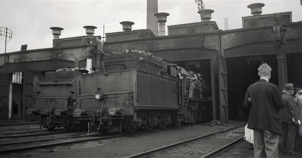 Op deze foto zien we een stoomlocomotief van het type 10 (2C1 Pacific) aan de poorten van de tractiewerkplaats Schaarbeek. De tender van de locomotief wordt gevuld met water. Uiterst rechts op deze foto zien we een groep personen naast een waterkolom.
