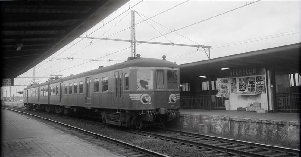 Op de foto zien we elektrisch motorstel 004 van de reeks MR 1939 in het station Mechelen. Dit tweeledig motorstel rijdt de trein met nr. 3050 van Mechelen naar Brussel-Zuid. Op het perron zien we een kiosk met kranten en tijdschriften.