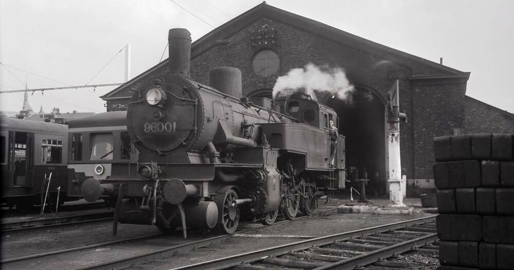 Op de foto zien we tenderlocomotief 96.001van het type 96 (1Ct) voor de deuren van de locomotiefloods in Ciney. Zij staat tussen een waterkolom en twee motorwagens van het type 551. Rechts op de foto zien we ook nog een stapel briketten van het kolenpark.