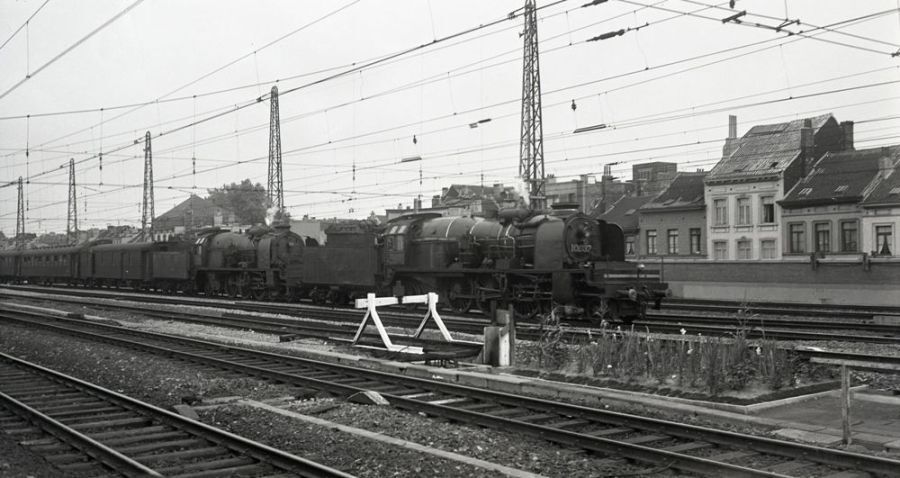 De stoomlocomotieven 10.037 en 10.016 van het type 10 (2C1 Pacific) slepen een reizigerstrein in de omgeving van het station Brussel-Noord. Deze trein met nummer 38 bestaat uit K-rijtuigen en is afkomstig van Jemelle. We zien duidelijk de bovenleiding over de sporen.