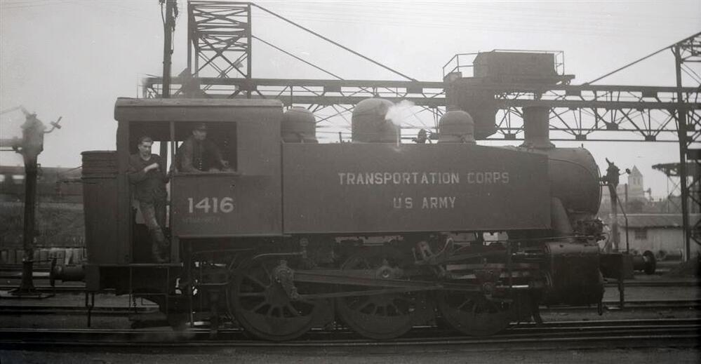 Na de Tweede Wereldoorlog heeft het Amerikaanse leger tijdelijk enkele locomotieven uitgeleend aan ons land om het tekort aan materieel op te vangen. We zien hier zo'n locomotief (Ct) aan het werk in Schaarbeek. Op de waterbak staat het opschrift 'Transportation corps US Army'. Op de achtergrond zijn de bekolingsinstallatie en een waterkolom zichtbaar.