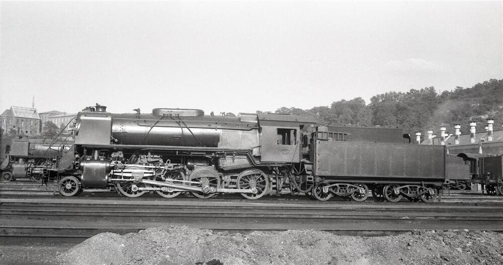 Een pas geleverde stoomlocomotief van het type 29 (1D Consolidation) staat voor de poorten van de locomotiefloods, die gedeeltelijk zichtbaar is. Op de achtergrond staan nog enkele andere stoomlocomotieven van hetzelfde type.
