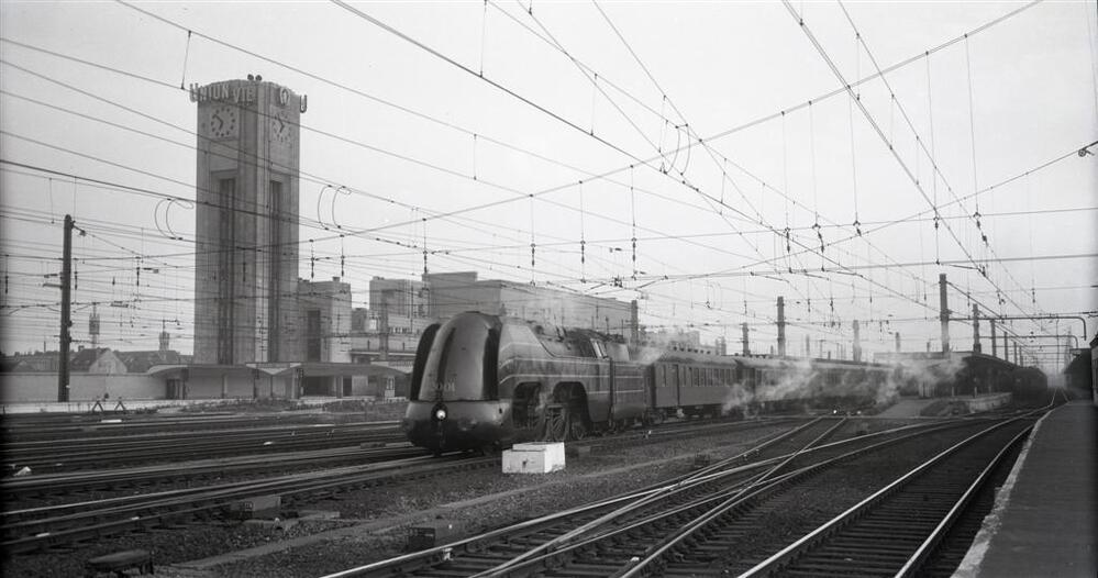 Op deze foto zien we een stoomlocomotief van het type 12 (2B1 Atlantic). Deze locomotief sleept een reizigerstrein, bestaande uit K1-rijtuigen. Deze trein komt van Schaarbeek en rijdt verder tot Rijsel. De toren van het station Brussel-Noord is van reclame voorzien. Op de voorgrond van deze foto zien we een Engelse wissel.