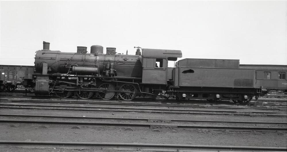 BeschrijvingOp deze foto zien we een stoomlocomotief van het type 81 (D Eight Coupler). Daarachter zijn een open wagen en een rijtuig te zien.