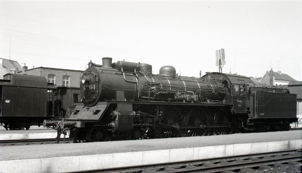 Deze foto toont locomotief 6204 van het type 62 (2C Ten Wheel) met tender 22.308 aan een perron van station Kortrijk. Achter de locomotief zien we een GCI-bagagerijtuig met uitkijkpost en een GCI-rijtuig derde klas.