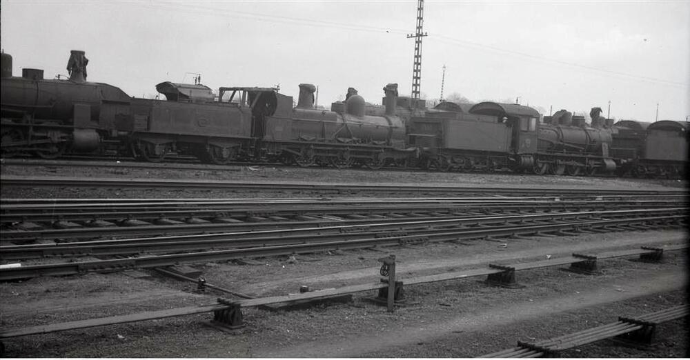 Op de foto zien we een aantal stoomlocomotieven die staan terzijde gesteld in de stelplaats Muizen. We herkennen locomotief 2912 van het type 29 (C Bourbonnais) en een aantal locomotieven van het type 71 of 72 (D Eight Coupler).