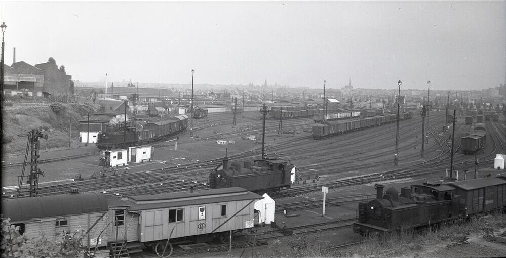 Drie stoomlocomotieven van het type 53 (Dt) met de nrs. 53.190, 53.239 en 53.192 zijn aan het werk in de sporenbundel van Thurn en Taxis. Op de voorgrond is stationair dienstvoertuig 190134 te zien. Verder zien we diverse goederenwagens, mechanische seinen en lantaarnpalen.