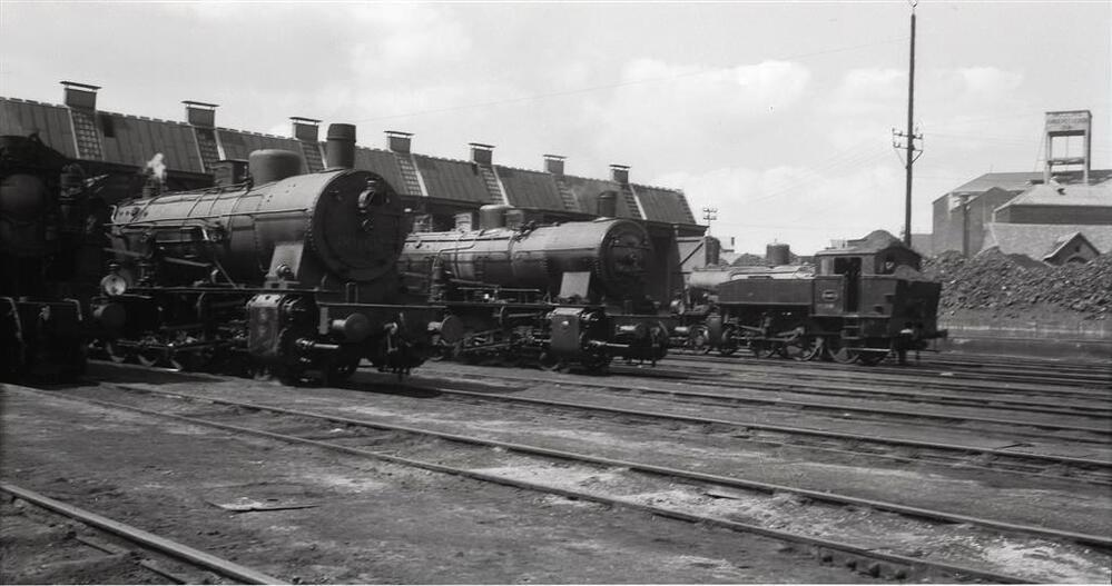 Diverse stoomlocomotieven voor de locomotiefloods in Antwerpen-Dam