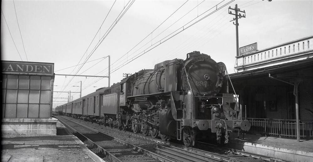 BeschrijvingOp deze foto zien we een stoomlocomotief van het type 29 (1D Consolidation). Deze locomotief heeft een reizigerstrein aan de haak en staat aan het perron in het station Landen.