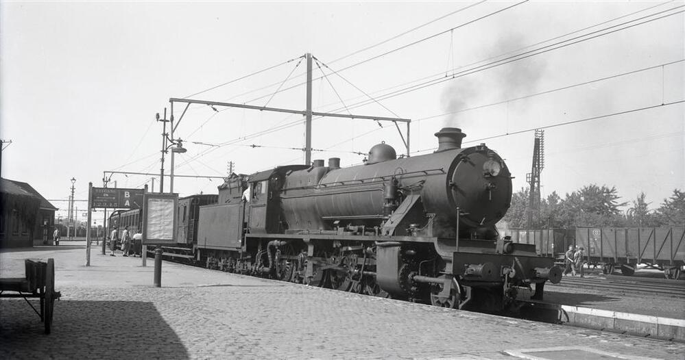 Op deze foto zien we een stoomlocomotief van het type 31 (1D Consolidation). Deze locomotief staat gereed om de GCI-rijtuigen naar Hasselt te brengen. Rechts op de foto zien we een hoge telefoonpaal en goederenwagens.