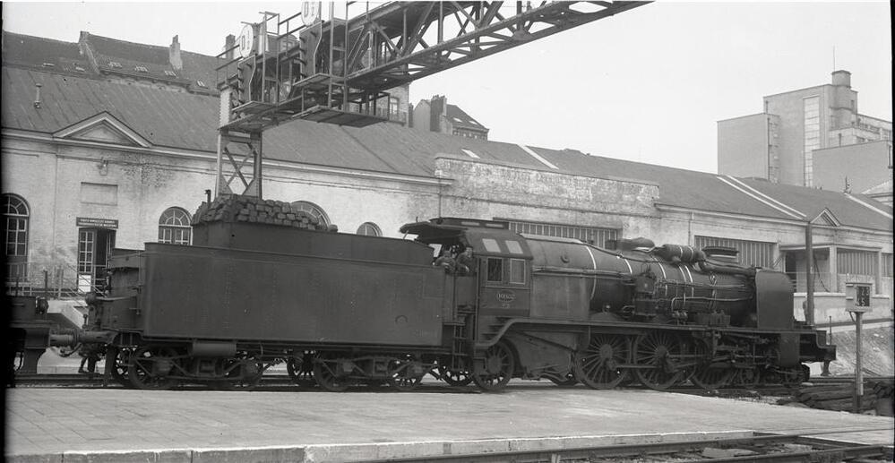 BeschrijvingOp deze foto zien we een stoomlocomotief van het type 10 (2C1 Pacific). Boven de locomotief bevindt zich een seinbrug voor de lichtseininrichting.