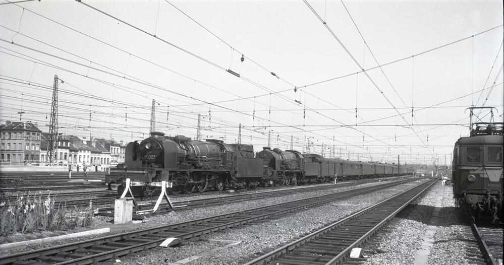 Op deze foto zien we twee stoomlocomotieven van het type 10 (2C1 Pacific). Zij slepen een reizigerstrein in dubbeltractie (één trein getrokken door twee locomotieven beide bestuurd door een machinist) naar het station Brussel-Noord. Vóór de eerste locomotief zien we een stootblok. Uiterst rechts op de foto zien we een glimp van één van de eerste elektrische locomotieven type 101. De bovenleiding is opgehangen aan draagkabels die tussen metalen masten opgespannen zijn, om schade aan de bovenleiding te voorkomen bij een ontsporing.