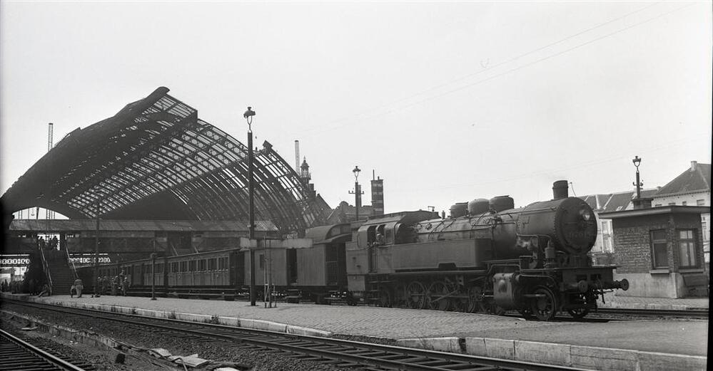 Op deze foto zien we een stoomlocomotief van het type 97 (1D1t). Deze locomotief zal een trein, bestaande uit GCI-rijtuigen, naar Leuven brengen. De trein staat aan het perron en deels onder de sporenhal, die in die periode afgebroken werd. Boven de sporen ligt een loopbrug die het lager gelegen deel van het station verbindt met de reeds opgehoogde elektrische spoorlijn tussen Brussel en Antwerpen (lijn 25).