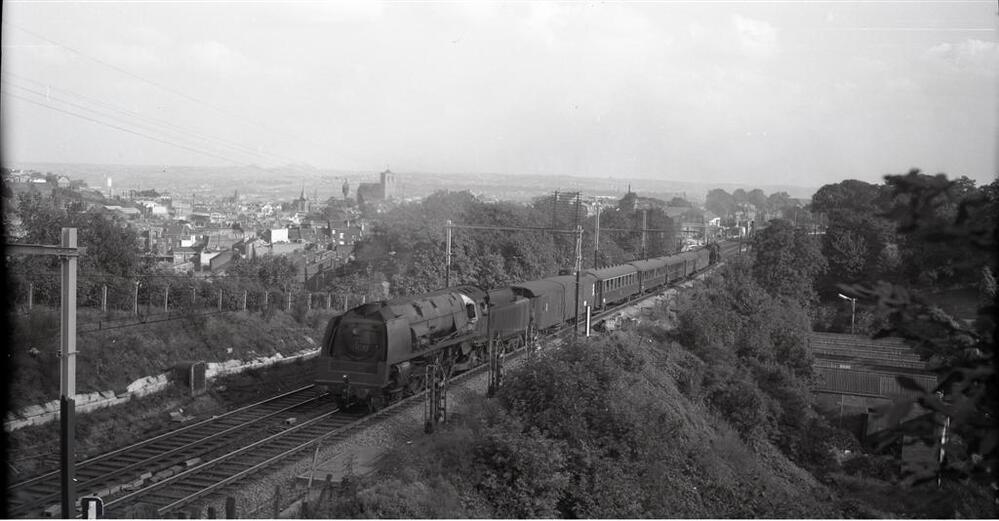 Op deze foto zien we een stoomlocomotief van het type 1 (2C1 Pacific). Deze trein rijdt de helling naar Ans op met K-rijtuigen aan de haak en wordt hiervoor ondersteund door een stoomlocomotief van het type 29 (1D Consolidation) als opdruklocomotief. Op de achtergrond zien we een panorama van de stad Luik.