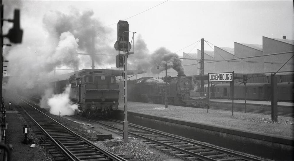 Stoomlocomotief 10.020 van het type 10 (2C1 Pacific) wacht met een internationale reizigerstrein op het vertreksein in het station Luxemburg. Links staat tenderlocomotief 507 van 'Les Chemins de Fer Luxembourgeois' (CFL) vóór een modern lichtsein. Een grondsein geeft de stand van de wissel weer. Verder zien we de perrons van het station Luxemburg, een stationsnaambord en een Belgische pakwagen met uitkijkpost voor de hoofdwachter.