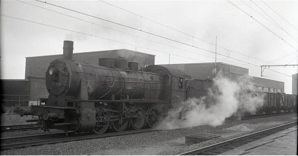 Op de foto zien we stoomlocomotief 81.006 van het type 81 (D Eight Coupler). Zij rijdt door het station Brugge met een goederentrein bestemd voor Zeebrugge. Op de achtergrond zien we het moderne stationsgebouw.