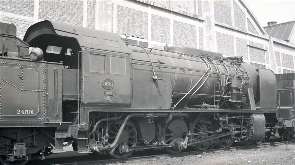 We zien een stoomlocomotief van het type 35 (1D Consolidation) voor de locomotiefloods van Ottignies. In 1930 werden vier locomotieven van dit type gebouwd (de nummers 5601 tot 5604, later hernummerd naar 3500 tot 3503 en sinds 1946: 35.001 tot 35.004). Ze werden voornamelijk ingezet voor goederentreinen.