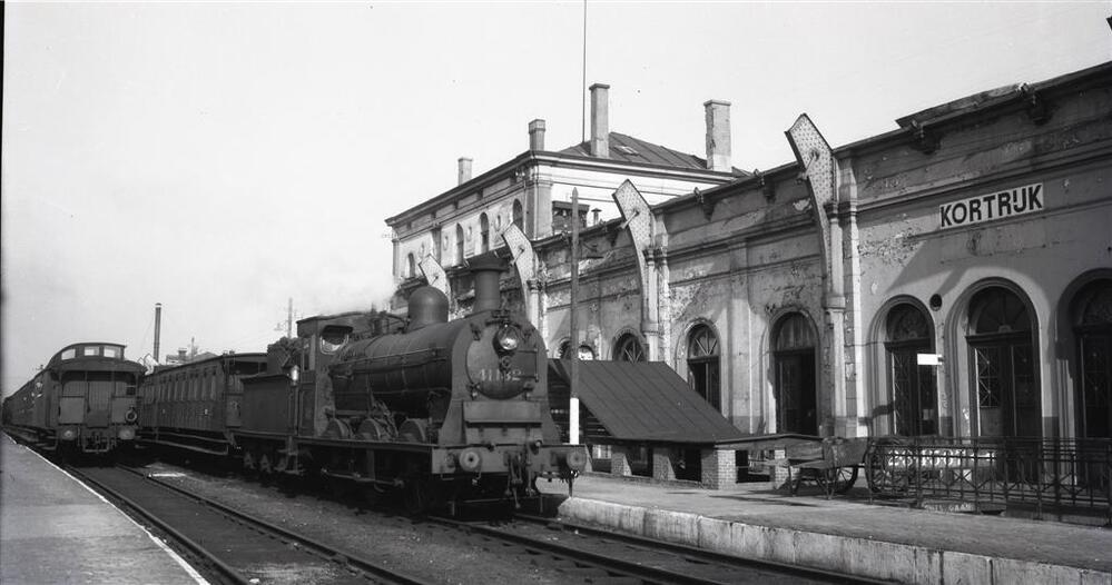 We zien stoomlocomotief 41.132 van het type 41 (C Bourbonnais) met een reizigerstrein in het station Kortrijk. De trein met nummer 8526 naar Oudenaarde bestaat uit een sleep GCI-rijuigen. Het perron aan het stationsgebouw heeft geen luifel. Aan het tweede perron zien we de achterzijde van een vertrekkende reizigerstrein.