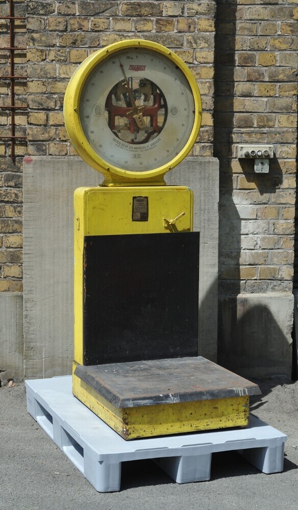 BeschrijvingGele weegschaal met een grote zwarte voetplaat om de bagage op te plaatsen. Bovenaan een ronde wijzerplaat die tot 200 kg gaat.