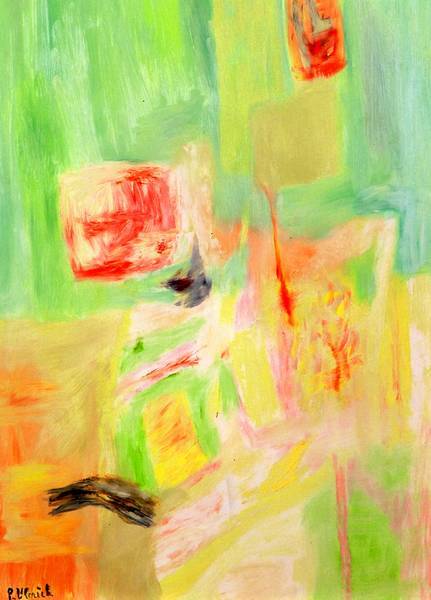 Non-figuratieve compositie van vlakken in groen-, geel- en oranjetinten