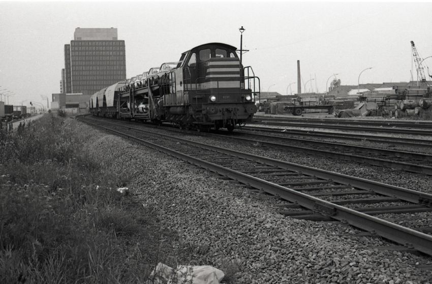 De locomotief sleept een goederentrein, bestaande uit een wagen voor het vervoer van auto's en enkele tremelwagens. Op de achtergrond zien we de haveninstallaties.
