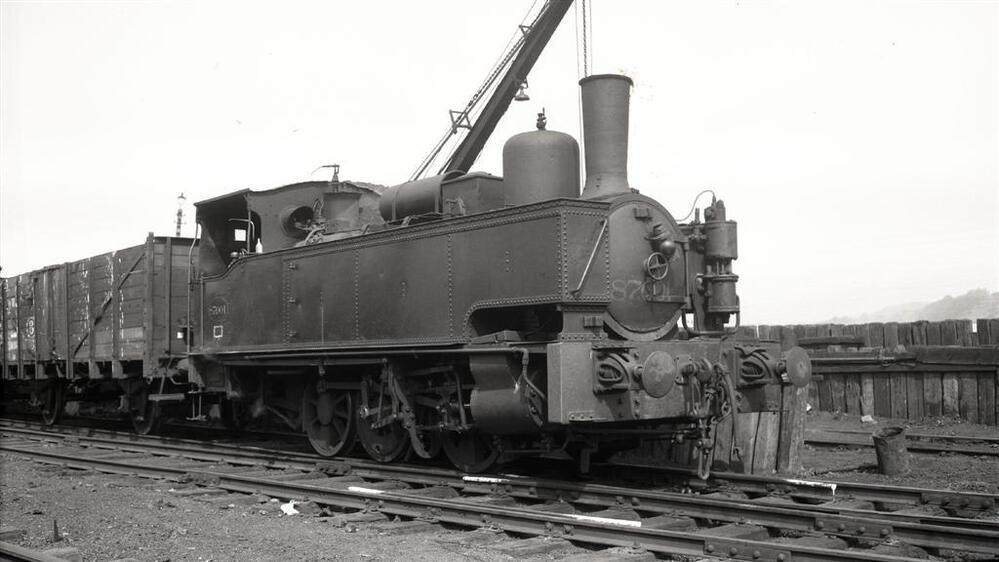 Deze foto toont de rechterzijde van een tenderlocomotief van het type 87 (Ct). Deze locomotief was oorspronkelijk in dienst van de 'Compagnie du Nord-Belge', onder het nummer 128. In 1941 kreeg zij het nummer 8728 en in januari 1946 werd ze hernummerd naar 87.001. In augustus 1946 wordt de locomotief echter verkocht aan de steenkoolmijn van Monceau-Fontaine waar ze het nummer 53 krijgt. De locomotief sleept een open wagen. Achter de locomotief zien we een kraan en een afsluiting gemaakt uit dwarsliggers.