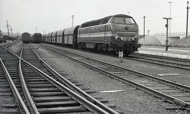 BeschrijvingDiesellocomotief 5533 sleept enkele goederenwagens. Op de voorgrond zien we een wissel.