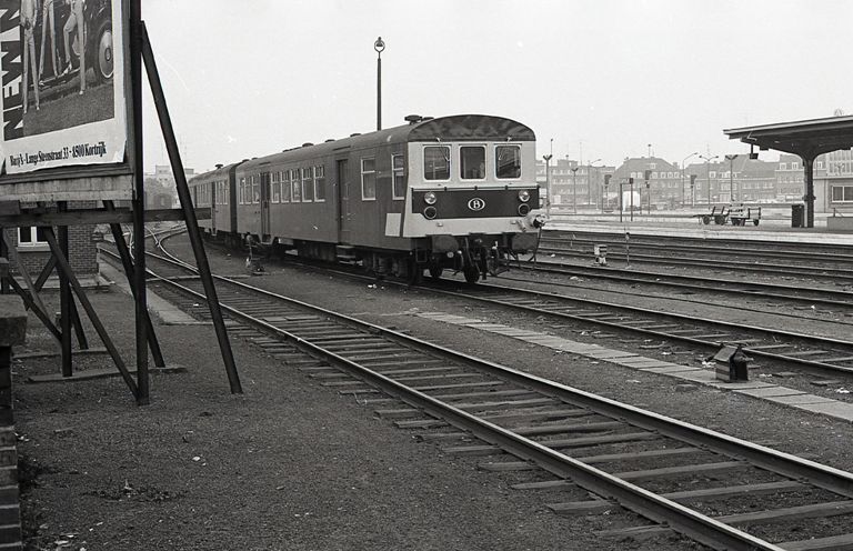 Deze reizigerstrein bestaat uit M 2-rijtuigen. Het eerste rijtuig is uitgerust met een stuurpost, wat wil zeggen dat de trein geduwd wordt door een locomotief. Op de achtergrond zien we een perron met luifel en zitbanken. Vooraan links zien we een reclamepaneel. Schenking van Myriam Hendrickx.