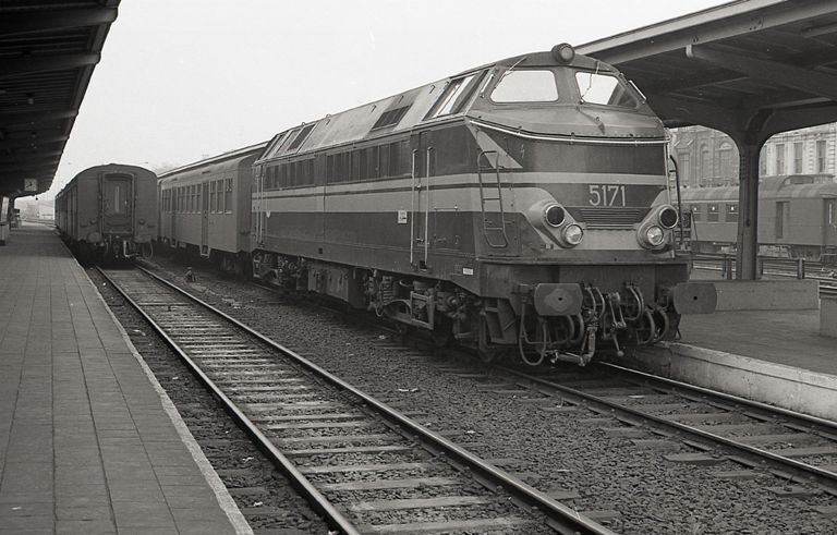 Diesellocomotief 5171 staat met een reizigerstrein aan het perron van het station Kortrijk. De trein is samengesteld uit M 2-rijtuigen. Op het naastliggende spoor staat nog een reizigerstrein met M 2-rijtuigen. Op de achtergrond is een K-bagagerijtuig te zien en verder hebben we zicht op de perrons en de luifels. Schenking van Myriam Hendrickx.