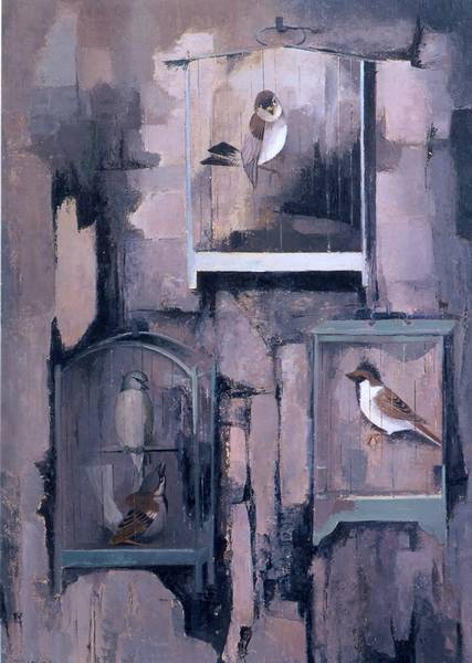 Begin jaren 1960 bestelde de NMBS een set van vier schilderijen bij de kunstenaar. Ze werden samen opgehangen in het rijtuig eerste klas 61 88 18 89 984 van de Trans Europ Express (TEE). Op dit schilderij staan drie vogelkooitjes waar vijf vogels in zitten.