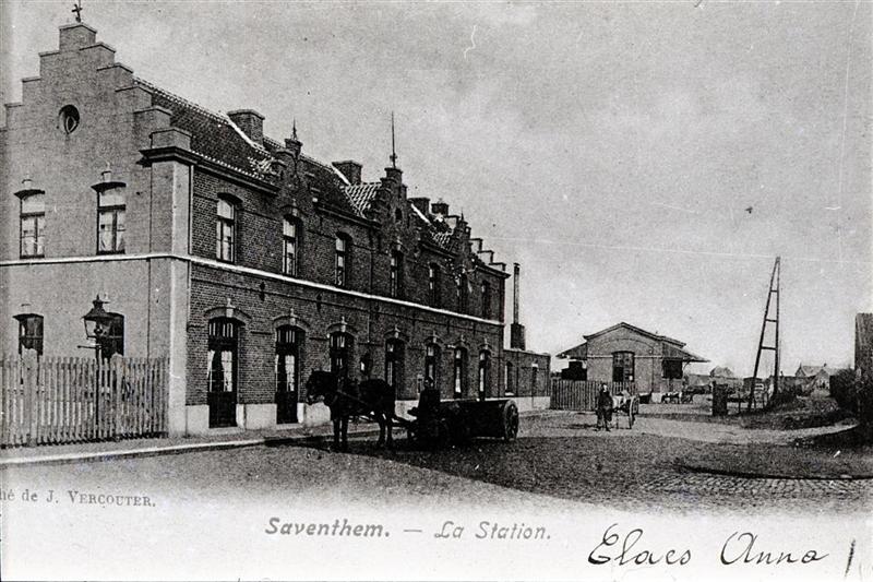 Reproductie van een postkaart met als opschrift 'Saventhem. - La Station Cliché de J. Vercouter'. We zien de voorzijde van het gebouw dat met trapgevels is bekroond. Op het stationsplein poseren een voerman met paard en kar en een man met stootkar. Op de achtergrond bevindt zich de goederenloods. Rechts ervan staat een telefoonpaal. De toegang tot het perron is afgeschermd met een houten schutting. Links van het stationsgebouw staat een petroleumlantaarn opgesteld. De voorzijde van de postkaart is onderaan ondertekend met 'Claes Anna'.