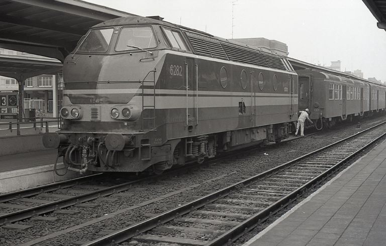 Een diesellocomotief van de reeks 62 met M 2-rijtuigen is aangekomen in het station Kortrijk en wordt door een rangeerder losgekoppeld. We hebben ook zicht op de perrons en de luifels.