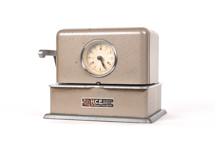Deze prikklok controleert de arbeidsduur van de werknemers door het dagelijks registreren van aankomst- en vertrektijden. De mechanische prikklok werd bediend door de hendel aan de linkerkant. Werknemers moesten een papier of karton in de gleuf schuiven en aan de hendel trekken waardoor de datum- en uurstempel werd afgedrukt. Vooraan is ook een uurwerk.