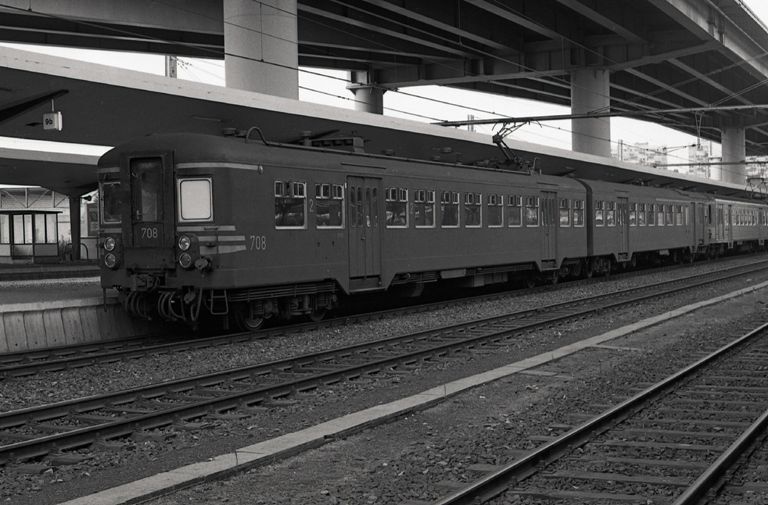 Tweeledig motorstel 708 behoort tot de reeks 06 schijf 1974. De reizigerstrein staat aan het perron in station Charleroi-Zuid.