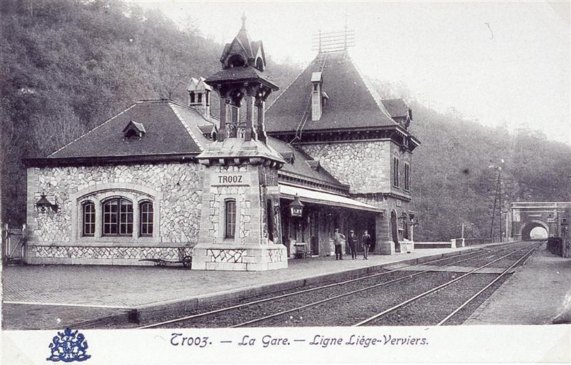 Reproductie van een postkaart met als opschrift 'Trooz. - La Gare. - Ligne Liége-Verviers'. Onderaan links staat het logo van de uitgever. Het stationsgebouw is opgericht in breuksteen en ligt aan een dubbele spoorbaan in de vallei van de Vesder. In die tijd was het gebruikelijk om de dwarsliggers volledig onder te stoppen met ballast. De stationsnaam staat vermeld op het slanke torentje. Op het dak van het station zien we een mast voor telefonie en telegrafie. Voor de verlichting van beide perrons werden petroleumlantaarns gebruikt. Voor het gebouw poseren drie spoorwegambtenaren. Op de achtergrond bevindt zich de ingang van de tunnel van Trooz.