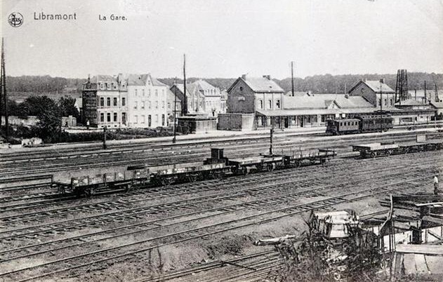 Reproductie van een postkaart met als opschrift 'Libramont La Gare.' Bovenaan links staat de naam van de uitgever. Rechts zien we de achterzijde van het stationsgebouw met perron en luifel. Aan het tweede perron staan twee ex-Duitse rijtuigen opgesteld. In de sporenbundel ontwaren we een waterkolom en zes platte goederenwagens waarvan één met een remmershuisje is uitgerust. Vooraan liggen kabels voor de bediening van de wissels en mechanische seinen. Op de achtergrond zijn telefoonpalen en rechts van het station een telefoon- en telegraafmast zichtbaar.