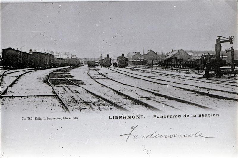 Reproductie van een postkaart met als opschrift 'N° 783. Edit. L. Duparque, Florenville Libramont. - Panorama de la Station. Deze postkaart toont de sporenbundel van het station met drie stoomlocomotieven, enkele goederenwagens, twee waterkolommen en verlichtingslantaarns. Aan de middelste locomotief poseren drie leden van het spoorwegpersoneel. Een dunne sneeuwlaag overdekt het geheel. Onderaan rechts staat "Ferdinande" geschreven.