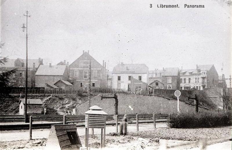 Reproductie van een postkaart met als opschrift '3 Libramont. Panorama'. We zien de sporenbundel, een verlichtingspaal, een wachtershuisje, twee waterkolommen, een mechanisch sein en een sein met ronde schijf. Op de voorgrond staat een weerstation. Bovenop het talud staan woningen die deel uitmaken van de woonkern van Libramont.