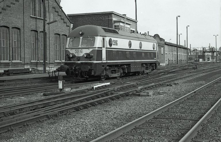 Op de foto zien we diesellocomotief 5916 in de stelplaats Antwerpen-Dam. Zij heeft reeds de tweekleurenschildering die vanaf de tweede helft van de jaren 1970 werd toegepast om de zichtbaarheid te verbeteren.