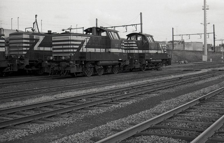 BeschrijvingOp de foto zien we een aantal rangeerlocomotieven in de stelplaats Antwerpen-Dam. We herkennen de diesellocomotieven met nummers 7410 en 7408 op de voorgrond.