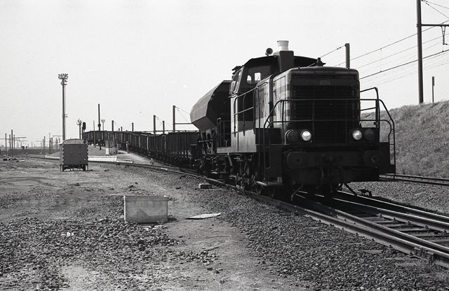 Een locomotief van de reeks 80 sleept een lange rij open bakwagens over de rangeerheuvel van het vormingsstation Gent-Zeehaven. Op de achtergrond is een verlichtingmast te zien.