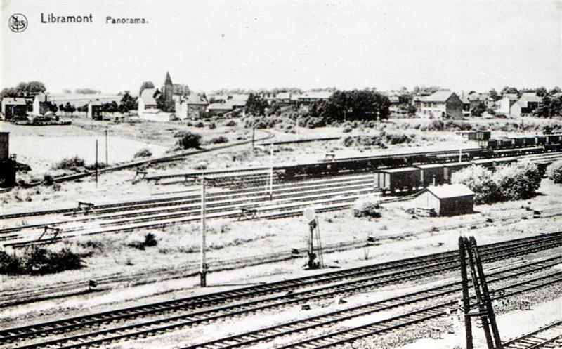 Reproductie van een postkaart met als opschrift 'Libramont Panorama'. Op de achtergrond bevindt zich de dorpskern met kerk van Libramont. Op de voorgrond strekt zich de sporenbundel van het station uit. We zien talrijke open en gesloten goederenwagens, meerdere stootblokken, een dienstgebouw, een mechanisch sein met ronde schijf en het bovenstuk van een telefoon- en telegraafpaal. Bovenaan links staat het logo van de uitgeverij 'Nels'.