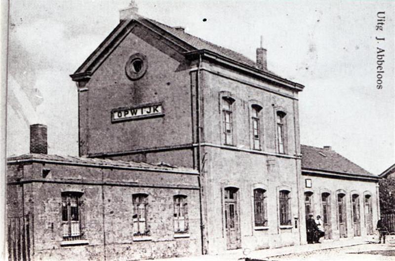 Reproductie van een postkaart waarop het station van Opwijk staat afgebeeld. Op de zijgevel bevindt zich de stationsnaam. Voor het gebouw poseren drie personen waarvan één in het bezit van een fiets is. Bovenaan rechts wordt de uitgever vermeld: 'Uitg J. Abbeloos'.