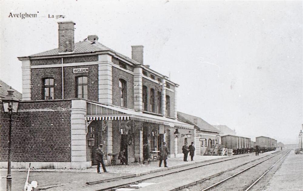 Reproductie van een postkaart met als opschrift 'Avelghem - La gare'. We zien de perronzijde van het station. De stationsnaam is in de zijgevel ingewerkt. Op het perron wachten reizigers onder de luifel. Het lage perron is uitgerust met petroleumlantaarns en zitbanken. Vooraan bevindt zich een een handel met tegengewicht om de wissel te bedienen. Naast de goederenloods staan gesloten goederenwagens opgesteld.