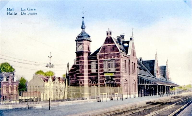 Reproductie van een ingekleurde postkaart met als opschrift 'Hal La Gare Halle De Statie'. We zien de zij- en achtergevel van het station, met haar uurwerktoren, spitse geveldaken en perronluifel. Het perron is afgesloten met gietijzeren hekken. Op het perron staat een elektrische verlichtingspaal met twee lampendragers.Ten gevolge van de werken aan de hoge snelheidslijn tussen Halle en de Franse grens werd dit station in 1995 afgebroken en vervangen door een moderne constructie boven de sporen.