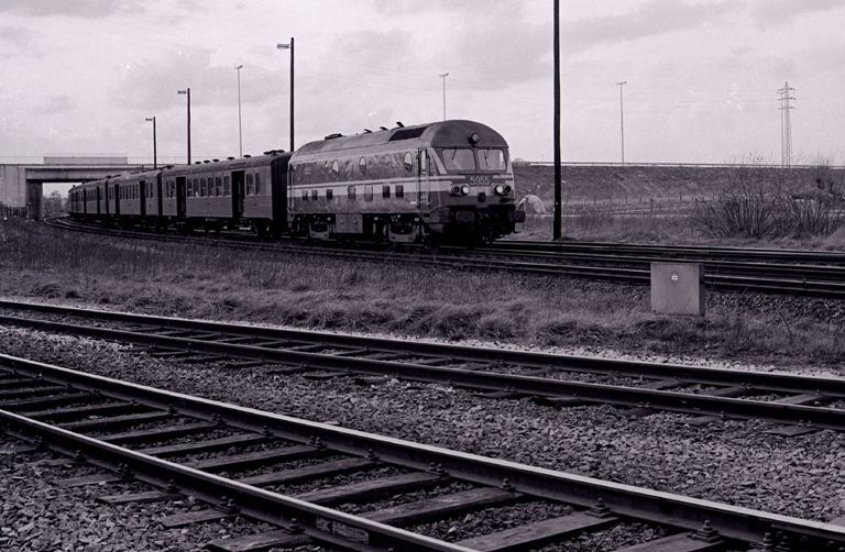 Op deze foto rijdt diesellocomotief 5955 station Lier binnen en is net onder de brug van de ring rond Lier doorgereden. Zij sleept een reizigerstrein bestaande uit een aantal M 1-rijtuigen en komt van Antwerpen via spoorlijn 15. Schenking van Myriam Hendrickx.