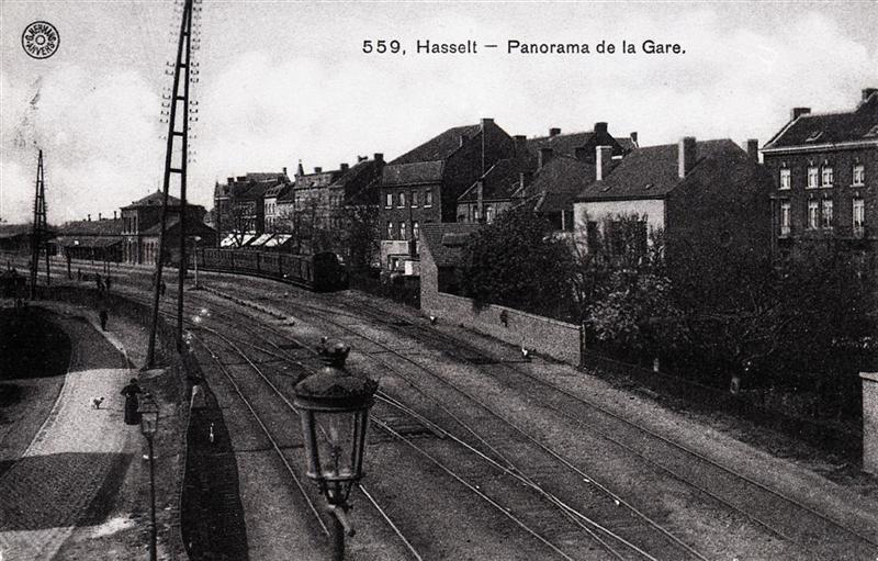 Reproductie van een postkaart met als opschrift '559. Hasselt - Panorama de la Gare.' Bovenaan links staat het logo van de uitgever. Op de achtergrond zien we de achtergevel van het stationsgebouw met luifel. Op een zijspoor staan reizigersrijtuigen opgesteld. Een dame met hond kuiert over een kasseiweg langsheen de afsluiting van het spoorwegdomein. Naast de sporen bevinden zich telefoon- en telegraafpalen en hendels voor de bediening van de wissels. De toegang tot de passerelle wordt met gaslantaarns verlicht.