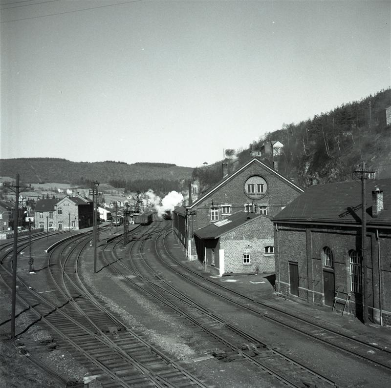 Deze foto toont de sporenbundel van het station Trois-Ponts. Rechts bevindt zich de locomotievenloods en op de achtergrond zien we het stationsgebouw. Kenmerkend voor de jaren 1950 zijn de mechanische seinen en de verlichtingspalen.