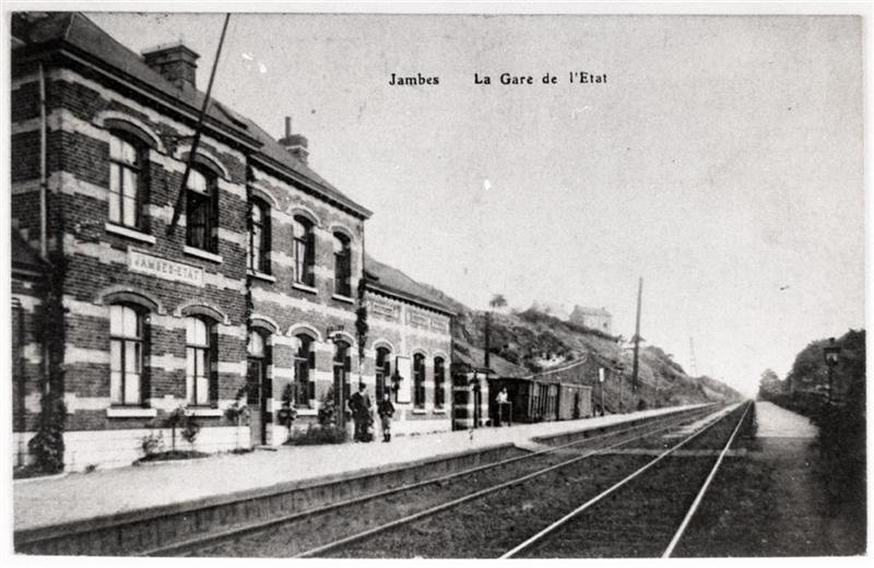 BeschrijvingReproductie van een postkaart met als opschrift 'Jambes La Gare de l' Etat'. We zien de achtergevel van het stationsgebouw waarop de benaming werd aangebracht. Op het perron poseren drie personen.