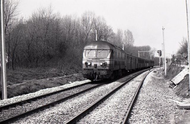 Op deze foto zien we diesellocomotief 5923 voorbijrijden te Ecaussinnes. Zij sleept een reizigerstrein samengesteld uit M 2-rijtuigen. De elektrificatiewerken van spoorlijn 108 zijn volop aan de gang.